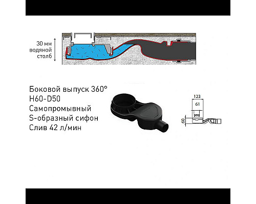 - Самопромывной S-образный сифон РР: выпуск D50-H60, монтаж 360 градусов.